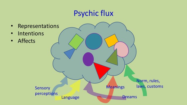 When Castoriadis outlines these different aspects of the psychic flux – representations, affects and intentions – he calls them “determinants”. I find that an unfortunate and misleading use of language. But he’s also clear that when we speak about these three different components, characteristics or aspects of the psychic field, we’re making a mistake in speaking as if they are somehow separate or separable. They are all indistinguishable and inseparable parts of a whole – the psychic flux affects us, shaped by our intentions, which shape and are shaped by our perceptions / representations.