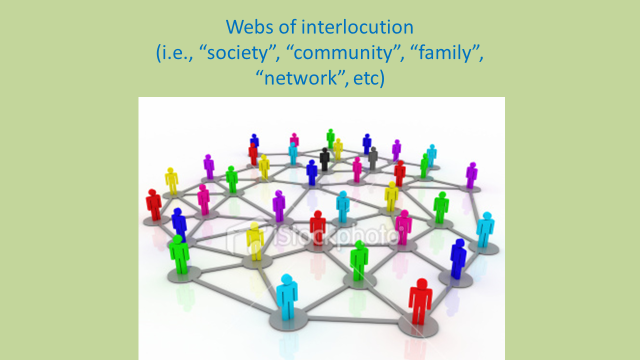 George Herbert Meade’s idea of “significant others” (family, primary care-givers) and the “generalised other” (community, society, the anonymous collective) are both part of what Taylor calls “webs of interlocution” (interlocution means conversation; discursive interaction).
