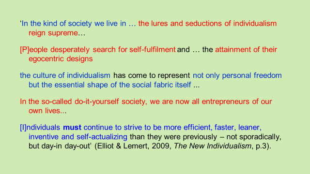 But this is only part of the story. Another important part of the story is that all of those interlocutors are themselves shaped by particular culture and conventions – so they’re not only calling upon us to identify ourselves, but to identify ourselves in accordance with accepted culture norms and values. One of the many reasons why the question of identity is particularly problematic today is that there is not a singular over-arching homogenous set of agreed upon values. There, are, though, dominant trends. Besides the values of consumerist society mentioned above, in the Anglo-sphere (at least) we are enmeshed in a culture of rugged and expressive individualism.