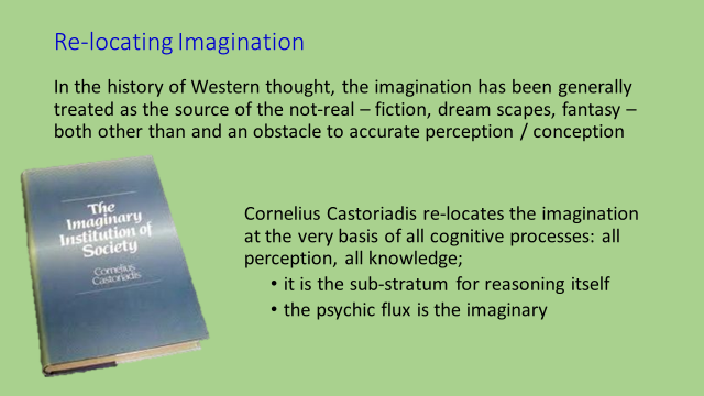 One of Castoriadis’s significant contributions is to understand the entirety of psychical life as imaginary. That is, in contrast to previous thinking about such things, he does not see the imagination as a separate faculty of the mind; certainly not as a secondary or problematic faculty. Instead, the psyche and the imagination are synonymous – the process of converting sensory perceptions, for example, into representations, intentions and affects is an imagining – a process of the radical imaginary. In short, the imagination is the primary process of the psyche; perceiving and reasoning are faculties of the imagination.