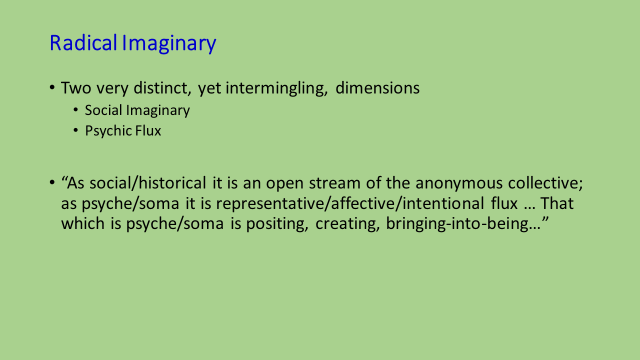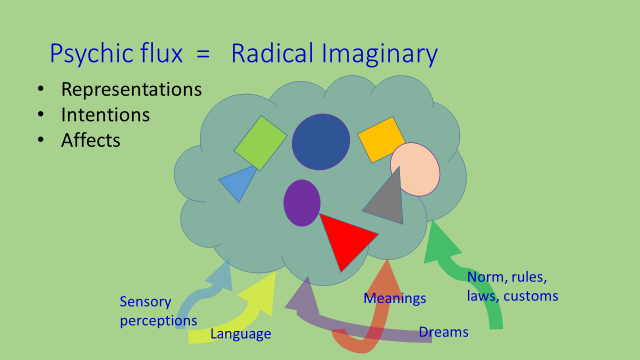 In short, he argues that it is misleading to speak of history and society has two separate things, when a society is nothing other than its history. We’ll look more closely at social imaginary significations, and thus the social imaginary field, after an elaboration of the psychic flux – the radical imagination of the singular person.