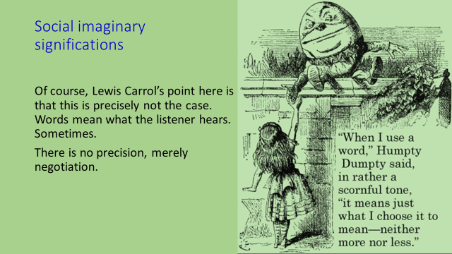 As discussed last week, we have a different experience of our emotional life when we have a richer vocabulary with which to describe it. This is a case in which language is constitutive of experience. Taylor and Castoriadis agree that the world as we know it is constituted by what Castoriadis calls social imaginary significations – which, like the subsets language and society, pre-exist any individual. They are here when we enter the world. We can interact, change, perhaps even add to the magma of SIS, but they will most likely survive any particular individual. By the same token, 40 years from now, no-one is going to understand my lament about the confusion arising from the changing meaning of the word literally, for it will literally mean something else.