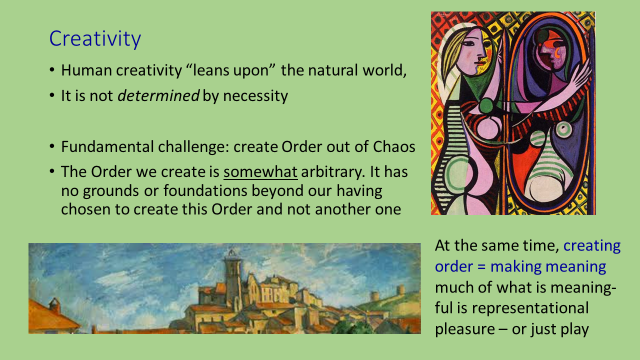 Another issue that Castoriadis has with the SIS god, besides it being used as an external authority which undermines our responsibility for the creation of our own laws, is that it also serves to deny our creativity more generally. According to the Judaeo Christian tradition, god created the heavens and the earth and all of the creatures and so on and so forth– most of you know this story better than I do, probably – and from this, all of creation was determined by something outside of us; something that also determined us, our nature, our laws, and so on.